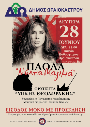 Η Πάολα συναντά τη Λαϊκή Ορχήστρα «Μίκης Θεοδωράκης» και ερμηνεύει το έργο του μεγάλου συνθέτη. Ένα πρόγραμμα αφιερωμένο στα πιο αγαπημένα και γνωστά λαϊκά, αλλά και λυρικά τραγούδια του συνθέτη. Συμμετέχει ο Παναγιώτης Καραδημήτρης, μουσική επιμέλεια Θανάσης Βασιλιάς.