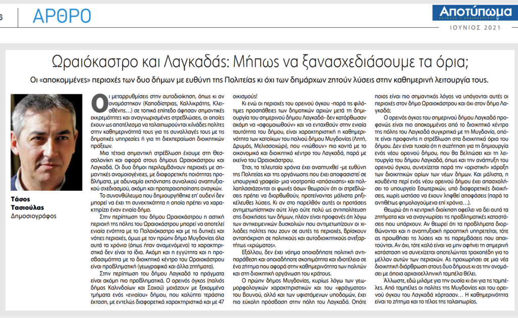 άρθρο του δημοσιογράφου Τάσου Τασιούλα στην εφημερίδα Ωραιοκάστρου – Λαγκαδά “Αποτύπωμα”