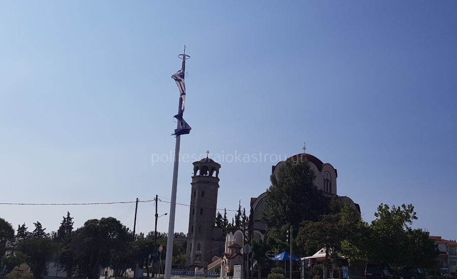 Με «δόξα και τιμή» κυματίζει η κουρελιασμένη ελληνική σημαία στην είσοδο του δήμου Ωραιοκάστρου στο ύψος της Γαλήνης.