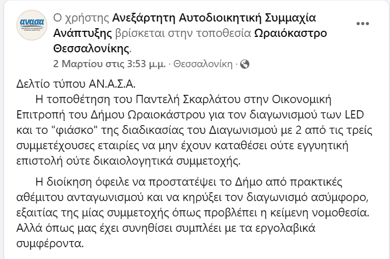 Σε πρόσφατη δημοσιοποίηση της τοποθέτησής του στην Οικονομική Επιτροπή του Δήμου Ωραιοκάστρου κάνει λόγο για «φιάσκο» σε σχέση με τον διαγωνισμό αντικατάστασης ηλεκτροφωτισμού με στόχο την εξοικονόμηση ενέργειας και την ενεργειακή αναβάθμιση.