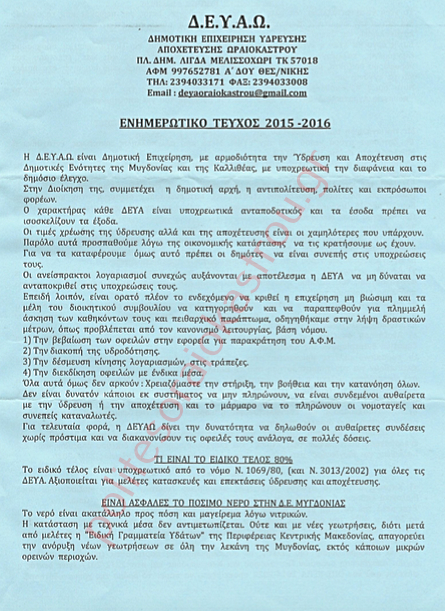 Η παραδοχή για ακατάλληλο νερό και το έγγραφο της ΔΕΥΑΩ «Ενημερωτικό Τεύχος 2015-2016»