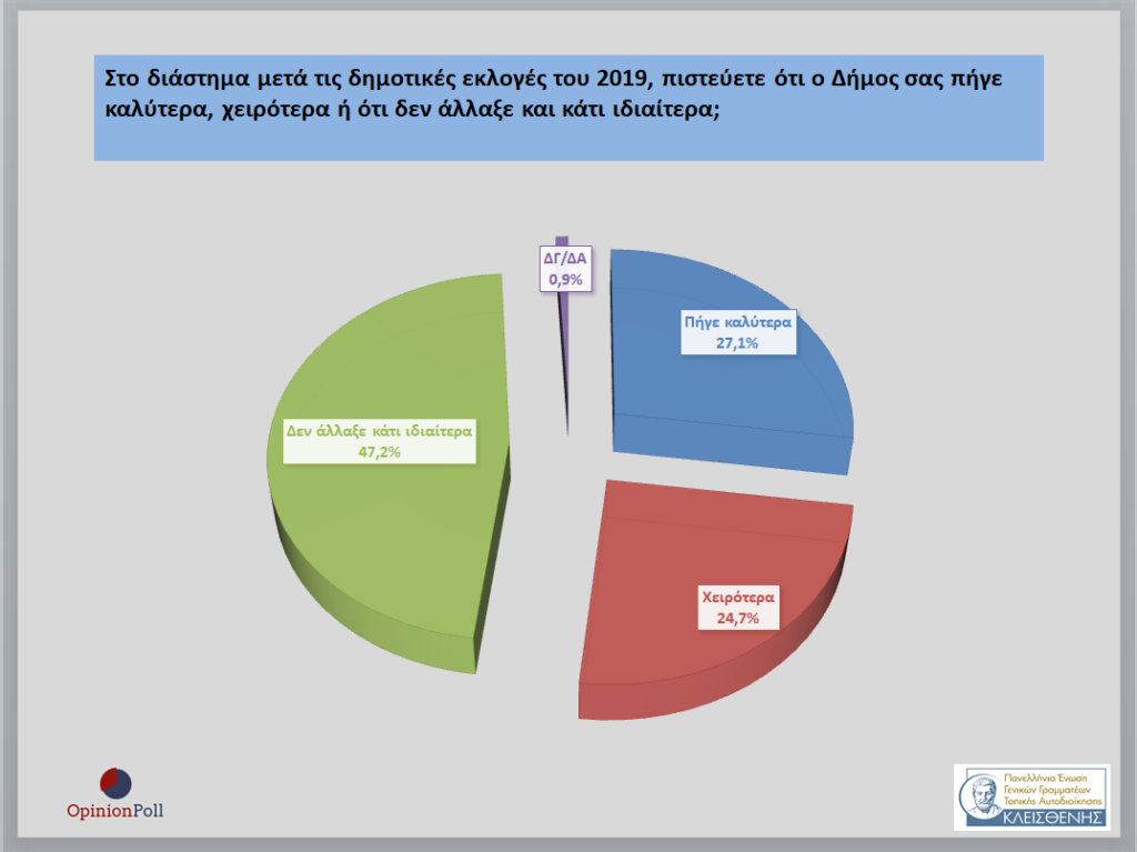 – Το 47.2% θεωρεί ότι στο διάστημα από τις δημοτικές εκλογές του 2019 μέχρι σήμερα δεν άλλαξε κάτι ιδιαίτερα στον Δήμο τους, το 27.1% ότι πήγε καλύτερα και το 24.7% ότι πήγε χειρότερα.