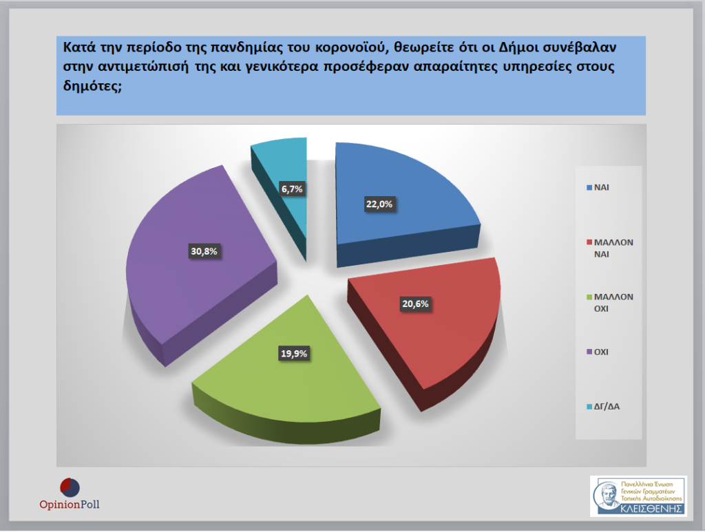 – Το 42.6% θεωρεί ότι οι Δήμοι συνέβαλαν στην αντιμετώπιση της πανδημίας και ότι γενικότερα προσέφεραν απαραίτητες υπηρεσίες στους δημότες με την πλειοψηφία να έχει αντίθετη άποψη με 50.7%