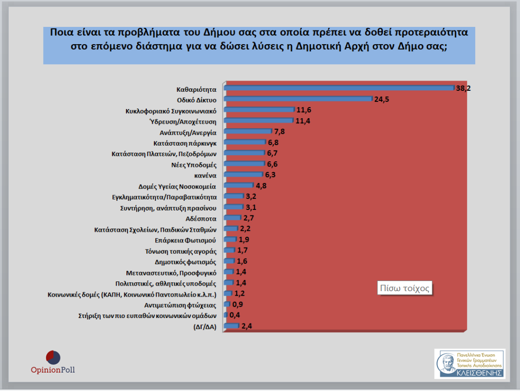 – Ως βασικότερα προβλήματα για τα οποία καλούνται να δώσουν λύσεις οι δημοτικές αρχές αναδεικνύονται η καθαριότητα με 38.2% , η κατάσταση του οδικού δικτύου με 24.5% , το κυκλοφοριακό/ συγκοινωνιακό με 11.6% , η Ύδρευση/ Αποχέτευση με 11.4% κ.λ.π