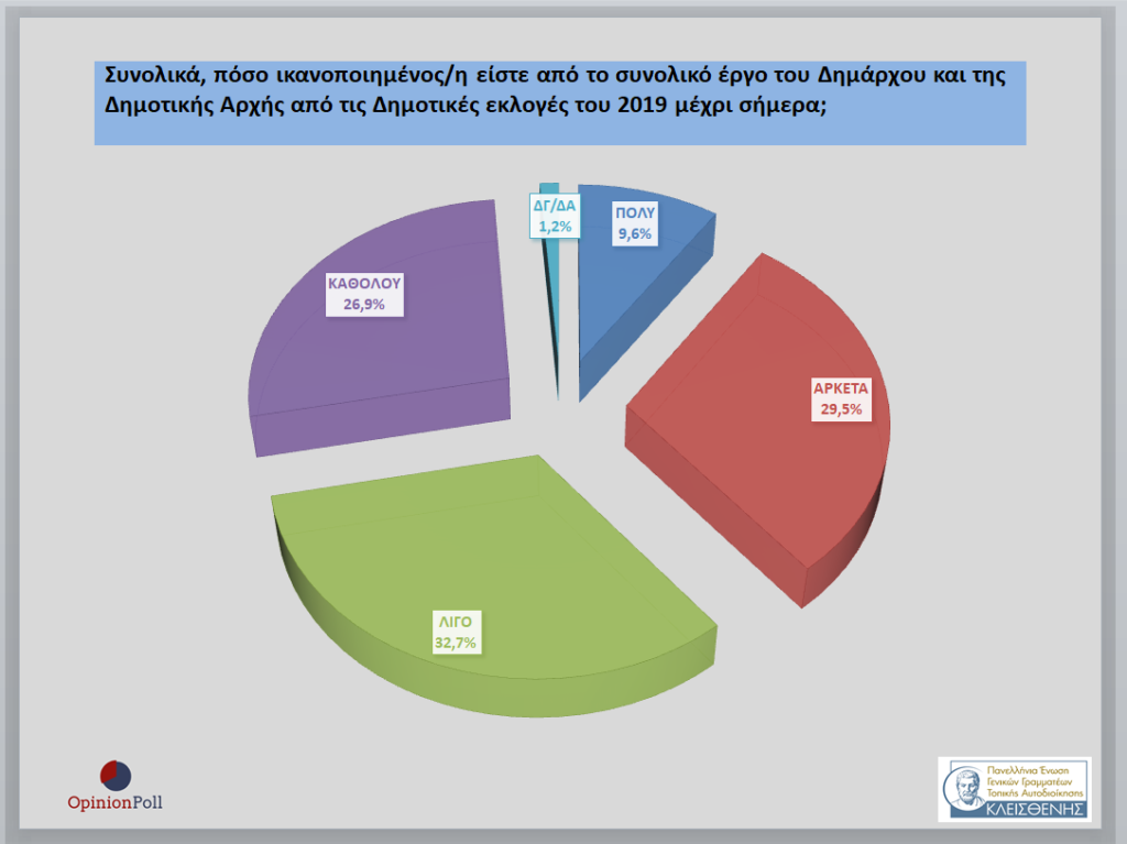 – Το 59.6% δηλώνουν ότι είναι λίγο και καθόλου ικανοποιημένοι από το συνολικό έργο των Δημάρχων και των Δημοτικών Αρχών, με το 36.5% να είναι πολύ και αρκετά ικανοποιημένοι.