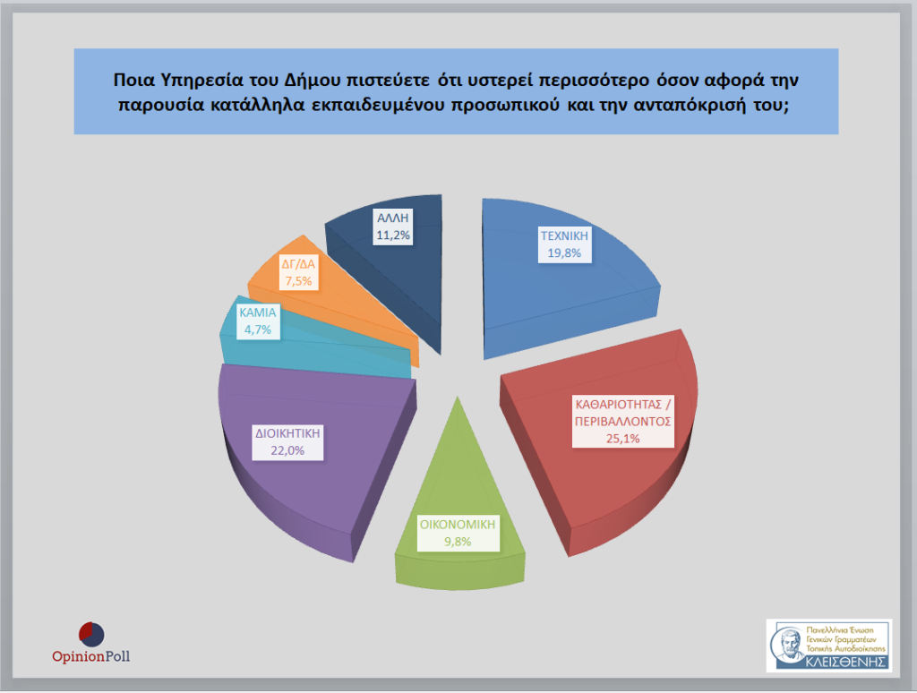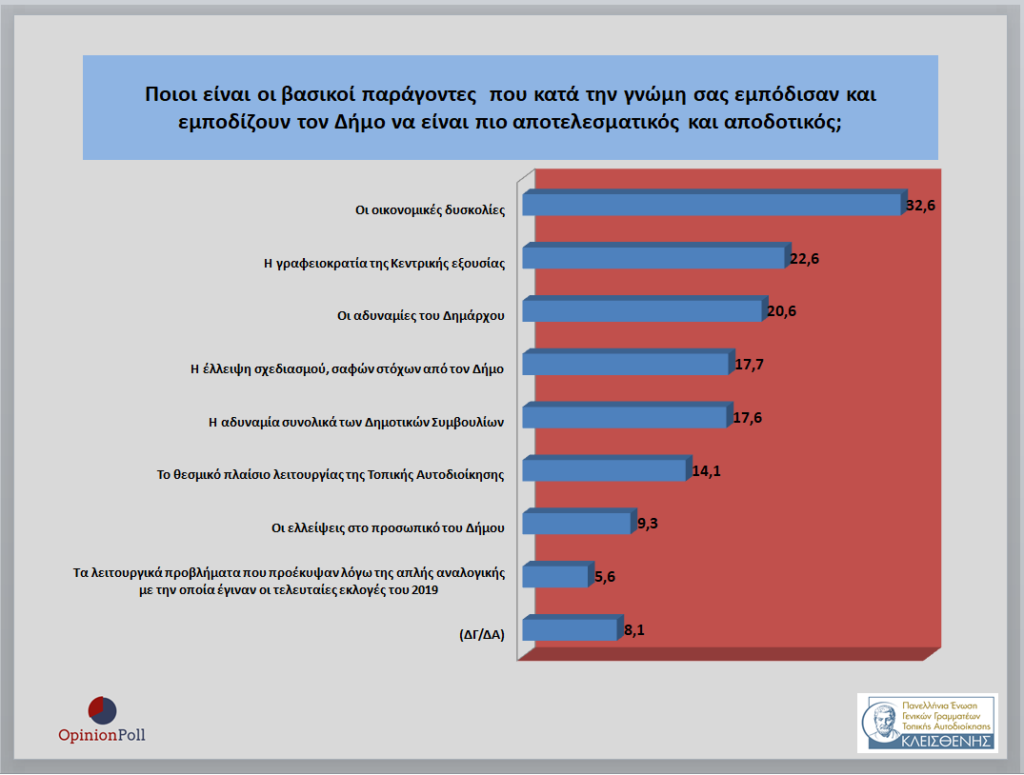 – Ως βασικοί παράγοντες που εμπόδισαν και εμποδίζουν να είναι πιο αποτελεσματικοί και αποδοτικοί οι Δήμοι αναδεικνύονται οι οικονομικές δυσκολίες με 32,6%, η γραφειοκρατία της Κεντρικής Εξουσίας με 22,6%, οι αδυναμίες των Δημάρχων 20.6%, η έλλειψη σχεδιασμού και σαφών στόχων από τους Δήμους με 17.7% , η αδυναμία συνολικά των Δημοτικών Συμβουλίων μς 17.6%, το θεσμικό πλαίσιο με 14.1%, οι ελλείψεις στο προσωπικό με 9.3% και τα προβλήματα που προέκυψαν λόγω της απλής αναλογικής με 5,6%.