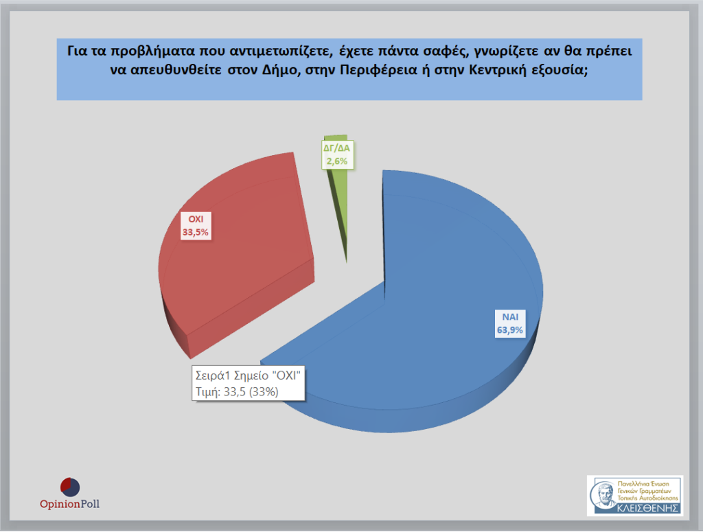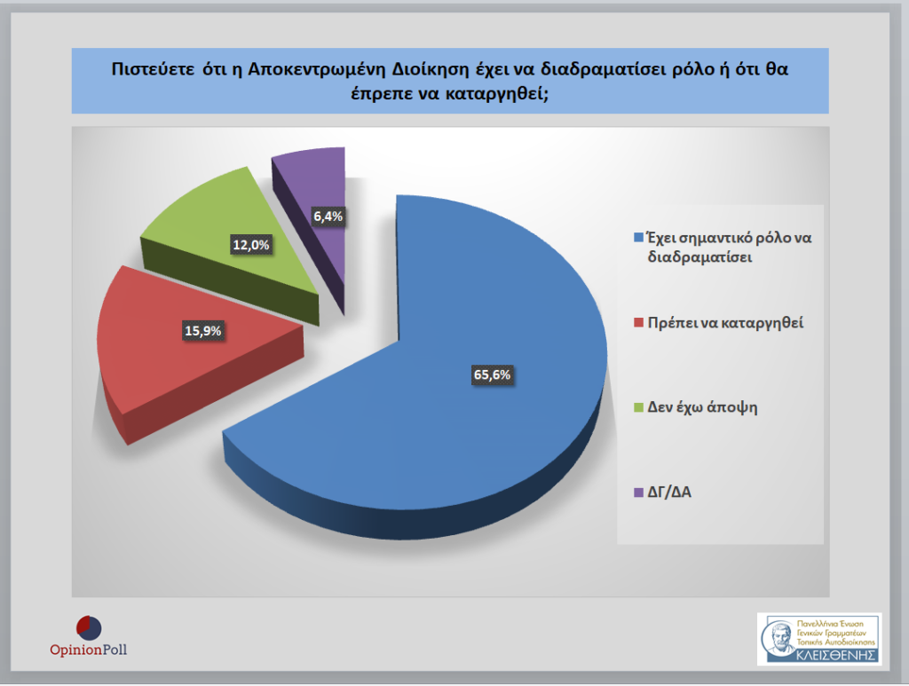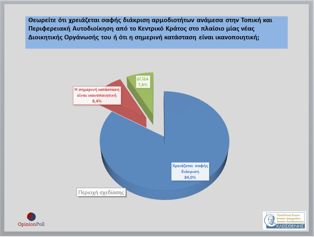 – Το 84% θεωρεί ότι χρειάζεται σαφής διάκριση αρμοδιοτήτων ανάμεσα στην Τοπική και Περιφερειακή Αυτοδιοίκηση από το Κεντρικό Κράτος το πλαίσιο μιας νέας Διοικητικής Οργάνωσής του Κράτους