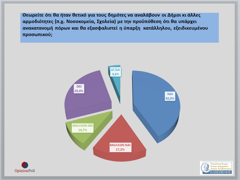 – Το 59.2% θεωρεί ότι θα ήταν θετικό για τους δημότες να αναλάβουν οι Δήμοι κι άλλες αρμοδιότητες ( π.χ Νοσοκομεία, Σχολεία) με την προϋπόθεση ότι θα υπάρχει ανακατανομή πόρων και θα εξασφαλιστεί η ύπαρξη κατάλληλου , εξειδικευμένου προσωπικού με το 36.1% να έχει αντίθετη άποψη