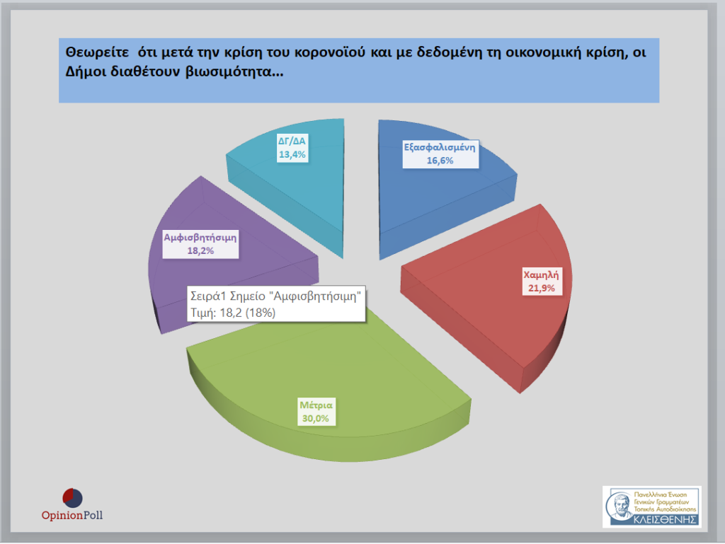 – Το 30% θεωρεί ότι οι Δήμοι έχουν μέτρια βιωσιμότητα, το 21.9% χαμηλή , το 18.2% αμφισβητήσιμη και το 16.6% εξασφαλισμένη