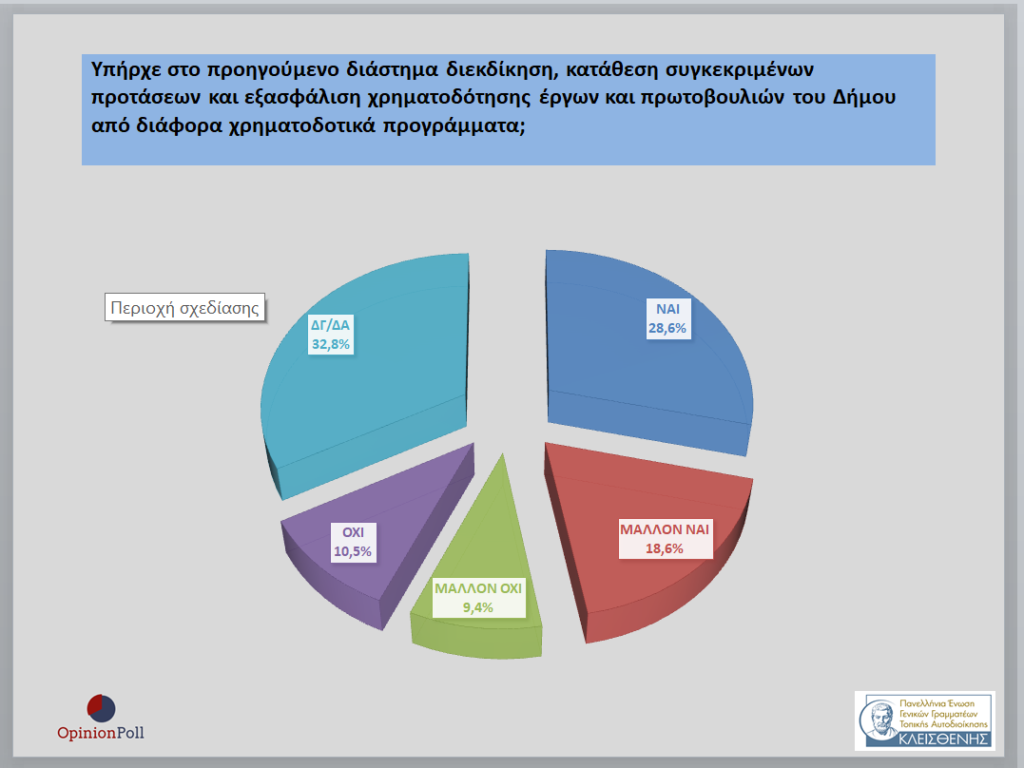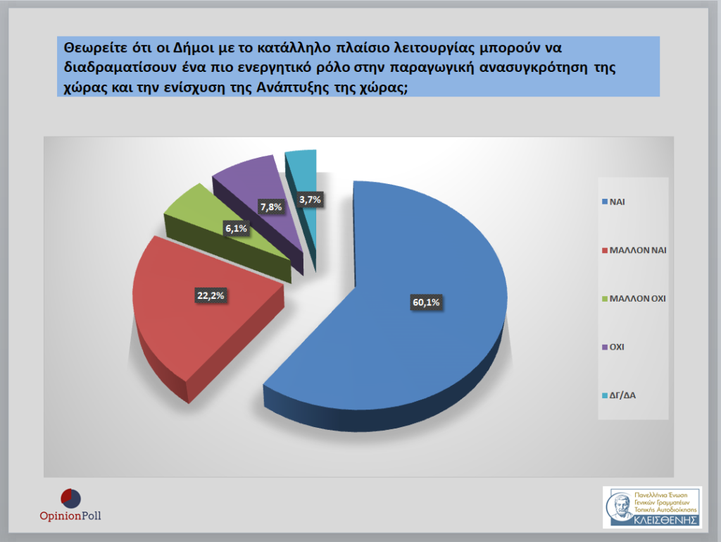 – Το 82.3% θεωρεί ότι οι Δήμοι με το κατάλληλο πλαίσιο λειτουργίας μπορούν να διαδραματίσουν ένα πιο ενεργητικό ρόλο στην παραγωγική ανασυγκρότηση της χώρας και την ενίσχυση της Ανάπτυξης της χώρας.