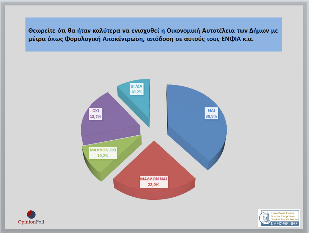 – Το 609% θεωρεί ότι θα ήταν καλύτερα να ενισχυθεί η Οικονομική Αυτοτέλεια των Δήμων με μέτρα όπως Φορολογική Αποκέντρωση , απόδοση σ΄αυτούς του ΕΝΦΙΑ κ.ά