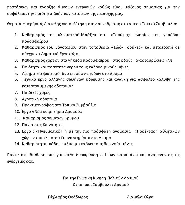 Αυτό καταγγέλλουν σε ανάρτησή τους στο διαδίκτυο τοπικοί σύμβουλοι της περιοχής, οι οποίοι μάλιστα καλούν τον πρόεδρο του Δρυμού να …ανταποκριθεί το συντομότερο δυνατό «σύμφωνα με τις αρμοδιότητές του στην σύγκλιση Τοπικού Συμβουλίου για ενημέρωση, συζήτηση και λήψη αποφάσεων επί ζητημάτων που απασχολούν την Τοπική Κοινωνία».