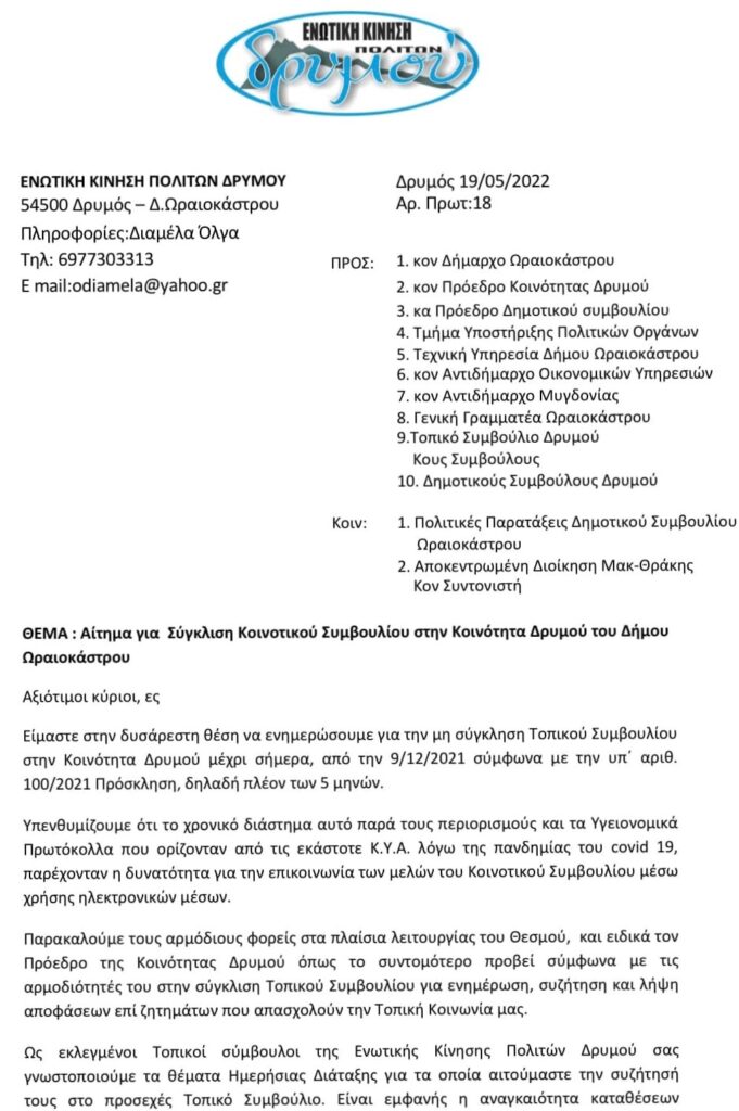 Επίσης, όπως υπογραμμίζουν, το χρονικό διάστημα της έξαρσης της πανδημίας «παρά τους περιορισμούς και τα Υγειονομικά Πρωτόκολλα που ορίζονταν από τις εκάστοτε Κ.Υ.Α. λόγω της πανδημίας του covid 19, παρέχονταν η δυνατότητα για την επικοινωνία των μελών του Κοινοτικού Συμβουλίου μέσω χρήσης ηλεκτρονικών μέσων», πράγμα που αφήνουν να εννοηθεί πως δεν έκανε ο πρόεδρος του Δρυμού.