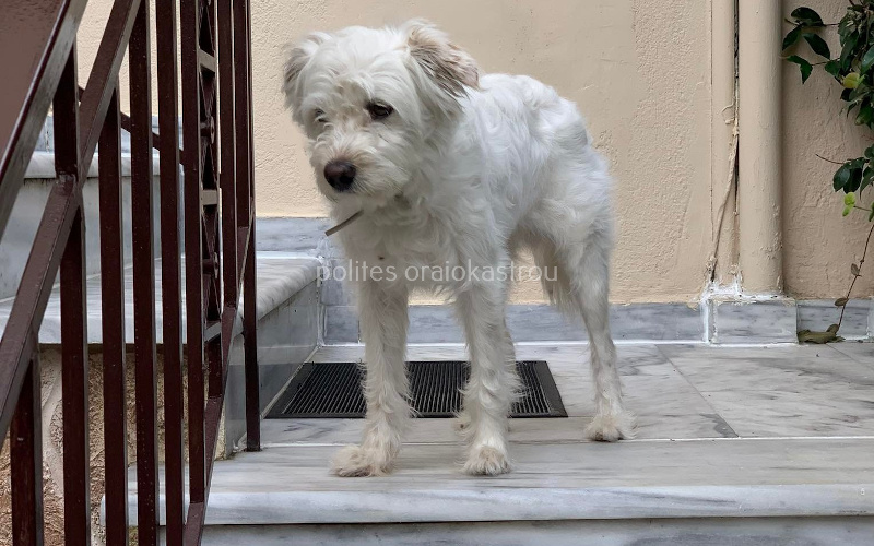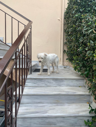 Είναι εδώ και τρεις μέρες στα σκαλιά ενός σπιτιού, κοιμάται κάθε βράδυ εκεί, δείχνει πολύ τρομαγμένο και δεν αφήνει να το πλησιάσει κανείς.