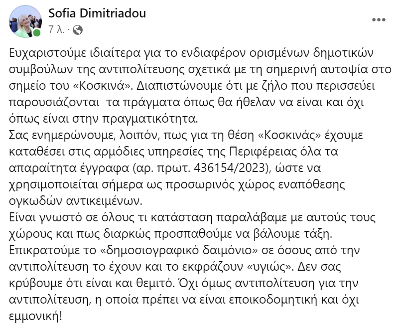 Η απάντηση της Αντιδημάρχου Καθημερινότητας, Σοφίας Δημητριάδου, στις καταγγελίες του κ. Τσακαλίδη σχετικά με τη χωματερή του «Κοσκινά» και τη σημερινή αυτοψία κλιμακίου της ΠΚΜ, ήρθε μέσα από τα social media και από τον προσωπικό της λογαριασμό στο fb.