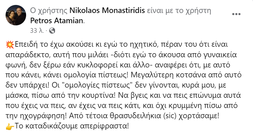 «Έξω από τα δόντια» η ανάρτηση του πατέρα Νικόλαου Μοναστηρίδη, προϊσταμένου του Ι.Ν Κοιμήσεως Θεοτόκου, σχετικά με την απίστευτη υπόθεση που βλέπει το φως της δημοσιότητας και αφορά τις «καοήθεις συκοφαντίες» (μέσω ηχητικού μηνύματος στο viber) κατά της θρησκευτικής υπόστασης του Πέτρου Αταμιάν, της συζύγου και των δύο μικρών παιδιών του!