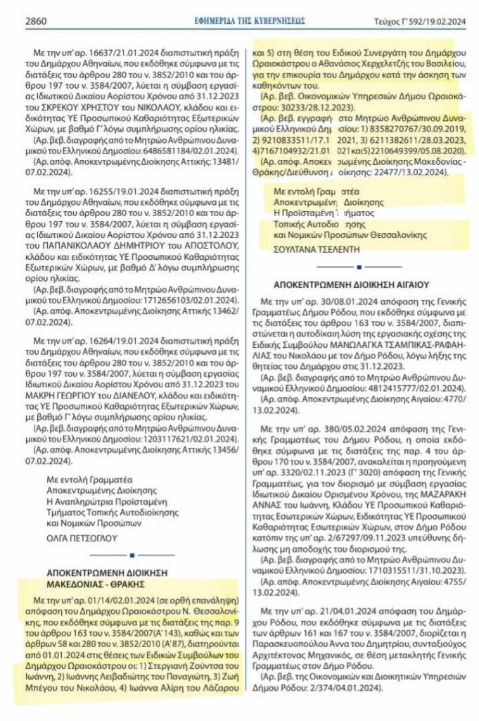Η απόφασή του δημοσιεύτηκε στο ΦΕΚ (19/02/2024) και πρόκειται για τους ειδικούς συμβούλους: Λειβαδιώτη Ιωάννη, Αλίρη Ιωάννα, Ζούντσα Στεργιανή, Μπέγου Ζωή καθώς και του ειδικού συνεργάτη στο γραφείο τύπου του Δ. Ωραιοκάστρου, Χερχελετζή Θάνο.