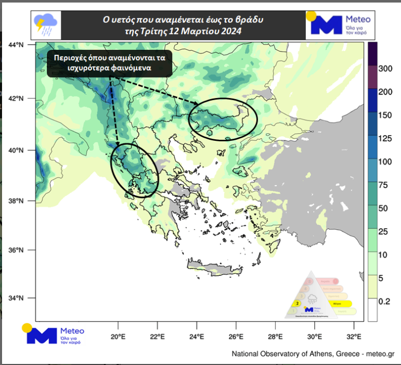 Δείτε τον χάρτη με τον αθροιστικό υετό που αναμένεται έως το βράδυ της Τρίτης 12/03, καθώς και οι περιοχές όπου αναμένονται τα ισχυρότερα φαινόμενα.