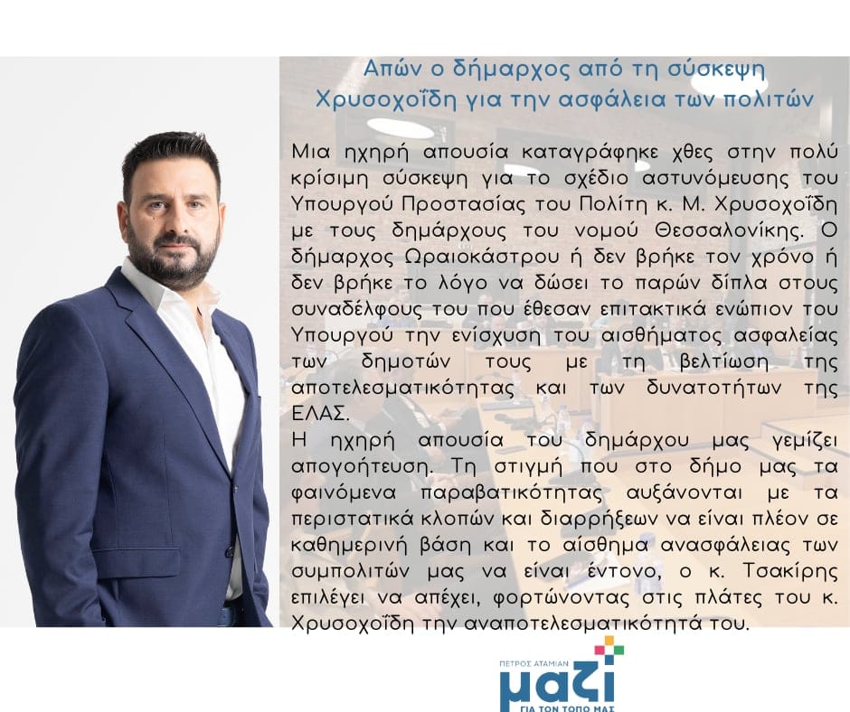Την απουσία του δημάρχου Ωραιοκάστρου Παντελή Τσακίρη – σε αντίθεση με τους άλλους δημάρχους του νομού Θεσσαλονίκης- από την «κρίσιμη σύσκεψη» του Υπουργού Προστασίας του Πολίτη κ. Μ. Χρυσοχοΐδη για το σχέδιο αστυνόμευσης στηλίτευσε με ανάρτησή του στο διαδίκτυο, ο επικεφαλής της μείζονας αντιπολίτευσης , Πέτρος Αταμιάν.