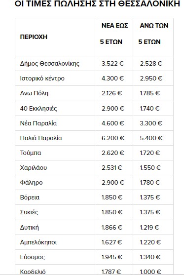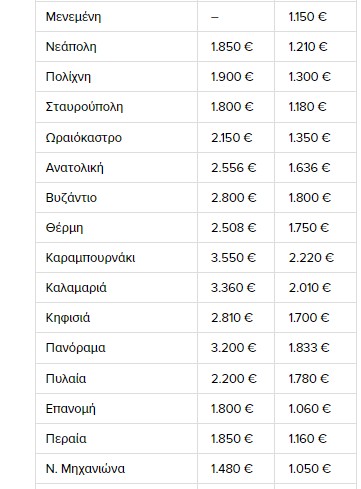 Στον αντίποδα, τις χαμηλότερες τιμές βλέπουμε στους Αμπελόκηπους με 1.627 ευρώ και 1.220 ευρώ, στο Κορδελιό με 1.787 και 1.000 ευρώ, ενώ η τρίτη φθηνότερη περιοχή είναι η Σταυρούπολη με 1.800 ευρώ ανά τ.μ. στα νεόδμητα και 1.180 ευρώ στα άνω των 5 ετών.