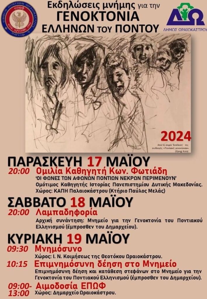 Εκδηλώσεις μνήμης για την 19η Μαΐου, Ημέρα Μνήμης της Γενοκτονίας των Ελλήνων του Πόντου, θα πραγματοποιηθούν στο Ωραιόκαστρο από την Ένωση Ποντίων Ωραιοκάστρου και Φίλων (ΕΠΩΦ) και με τη συμμετοχή του Δ. Ωραιοκάστρου.