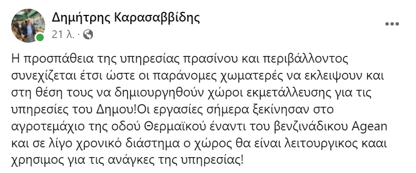 Τον καθαρισμό της παράνομης “δημοτικής” χωματερής από τον ανάδοχο εργολάβο ανακοίνωσε με ανάρτησή του ο Δ. Καρασαββίδης:
