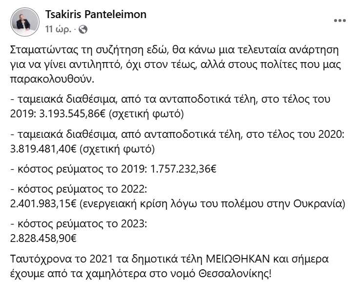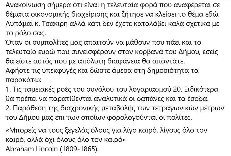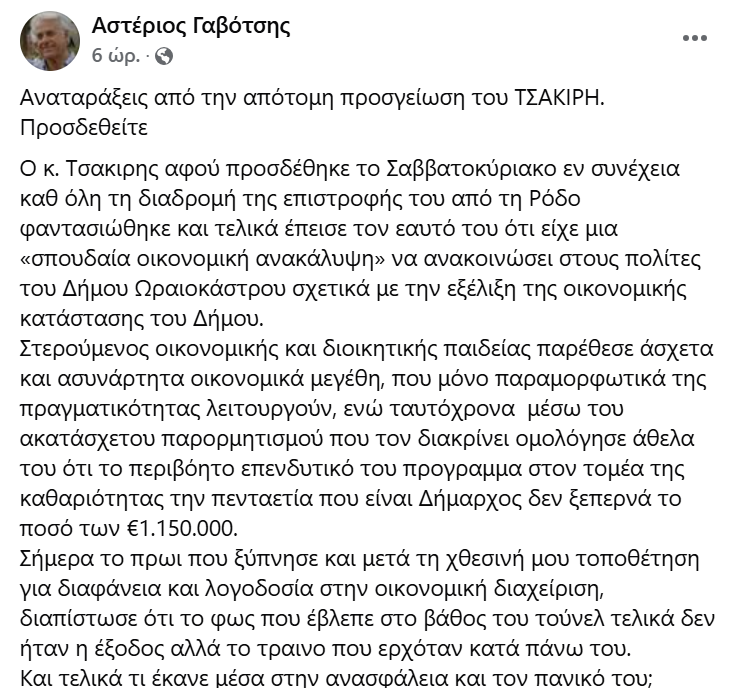 Με νέα ανάρτηση ο Αστέριος Γαβότσης επιμένει να ζητά από τον Παντελή Τσακίρη να δοθούν στη δημοσιότητα συγκεκριμένα οικονομικά στοιχεία: Ταμειακές ροές του συνόλου του λογαριασμού “20” με αναλυτικές δαπάνες και έσοδα, καθώς και τη μεταβολή των τετραγωνικών μέτρων του «επί των οποίων φορολογούνται οι πολίτες». Ο πρώην δήμαρχος Ωραιοκάστρου κάλεσε εκ νέου τον κ. Τσακίρη να απαντά στους πολίτες με απόλυτη διαφάνεια «όταν απαιτούν να μάθουν που πάει και το τελευταίο ευρώ που συνεισφέρουν στον κορβανά του Δήμου.»