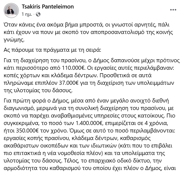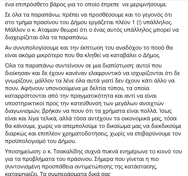 Επίσης ο κ. Τσακίρης παραδέχτηκε το έλλειμμα αναποτελεσματικών υπηρεσιών στο τομέα του πρασίνου της προηγούμενης θητείας του (αποδίδοντας ανάλογες ευθύνες στην προηγούμενη αρμόδια αντιδήμαρχο;) καθώς και το υπερ-τριπλάσιο κόστος για το δήμο Ωραιοκάστρου λόγω έλλειψης προσωπικού (1,4 εκατ. ευρώ δηλαδή 350.000 ευρώ τον χρόνο από 110.000 ευρώ που ήταν πριν στην πρώτη του θητεία).