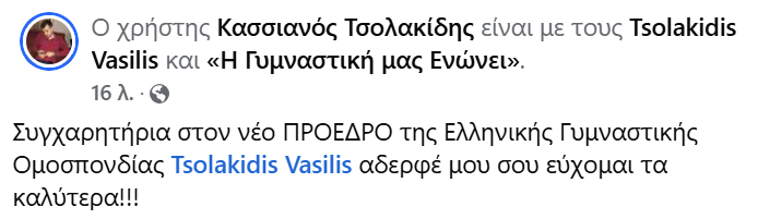Τα πρώτα …διαδικτυακά συγχαρητήρια ήρθαν από τα αδέρφια του, Σωκράτη και Κασσιανό. Του ευχόμαστε ολόψυχα να πραγματοποιηθούν όλα του τα σχέδια, για το άθλημα που τόσο πολύ αγαπά. Η δυναμική του προσωπικότητα, οι γνώσεις και η εμπειρία του στο χώρο του αθλητισμού να οδηγήσουν την Ελληνική Γυμναστική Ομοσπονδία ακόμα πιο ψηλά στο μέλλον.