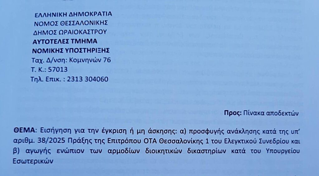 Σε αγωγή κατά του Υπουργείου Εσωτερικών προχωράει ο δήμος Ωραιοκάστρου! Ο λόγος; Η καθυστερημένη -σύμφωνα με το δήμο- υπογραφή του ΥΠΕΣ, Θοδωρή Λιβάνιου, σε αίτημα του δήμου για επιπλέον χρηματοδότηση (160.000 ευρώ) σχετικά με συμπληρωματικές εργασίες στο έργο του ρέματος «ΠΑΠΠΑ»! Το θέμα αφορούσε τις πλημμύρες τον Οκτώβριο του 2023, όπου οι δημοτική ενότητα Ωραιοκάστρου και δημοτική κοινότητα Φιλαδέλφειας κηρύχθηκαν σε κατάσταση έκτακτης ανάγκης.