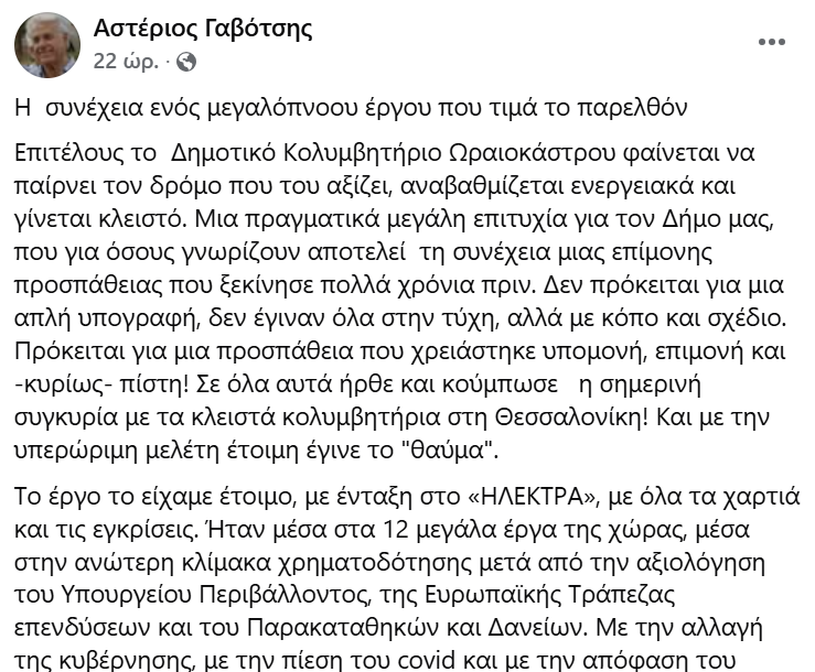 Με ανάρτησή του στον προσωπικό του λογαριασμό στο face book, ο πρώην δήμαρχος Ωραιοκάστρου, Αστέριος Γαβότσης, επανέρχεται στη δημόσια συζήτηση για το Δημοτικό Κολυμβητήριο, με αφορμή τη χρηματοδότηση των 5,7 εκατ., ευρώ για την ενεργειακή του αναβάθμιση και τη μετατροπή του σε κλειστό.