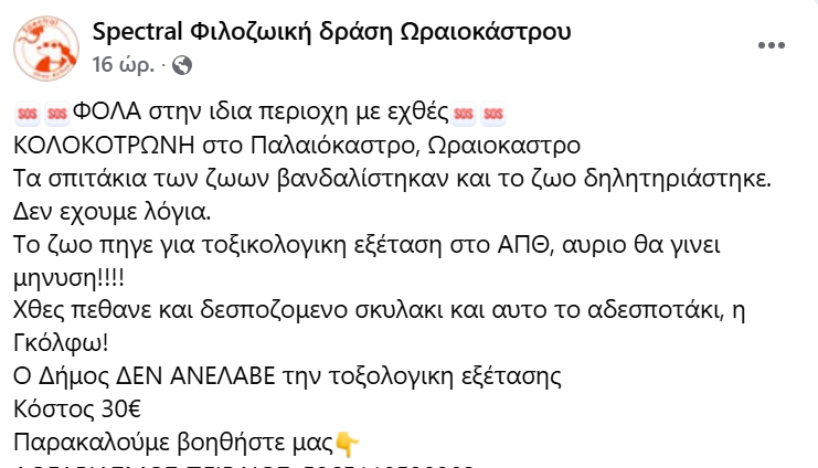 Η ανάρτηση στα social από την «Spectral Φιλοζωική Δράση Ωραιοκάστρου» δεν αφήνει περιθώρια παρερμηνείας: Επαναλαμβανόμενα περιστατικά με φόλες σε γειτονιές του δήμου Ωραιοκάστρου, για ζώα που χάνονται με φρικτό τρόπο! Ακόμα η ρίψη δηλητηρίων σε δημόσιο χώρο είναι πράξη επικίνδυνη και όποιος το κάνει, γνωρίζει πολύ καλά τι προκαλεί.