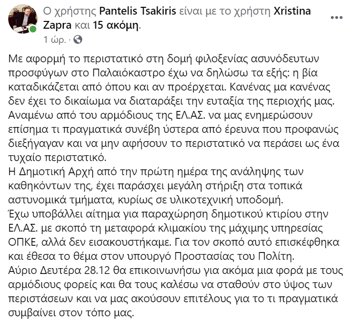 Επίσημη ενημέρωση από την Ελληνική Αστυνομία με το τι πραγματικά συνέβη στη δομή φιλοξενίας ασυνόδευτων προσφύγων στην καρδιά του Παλαιοκάστρου, καταδικάζοντας ταυτόχρονα τη βία από όπου προέρχεται, ζητά ο δήμαρχος Ωραιοκάστρου, Παντελής Τσακίρης.