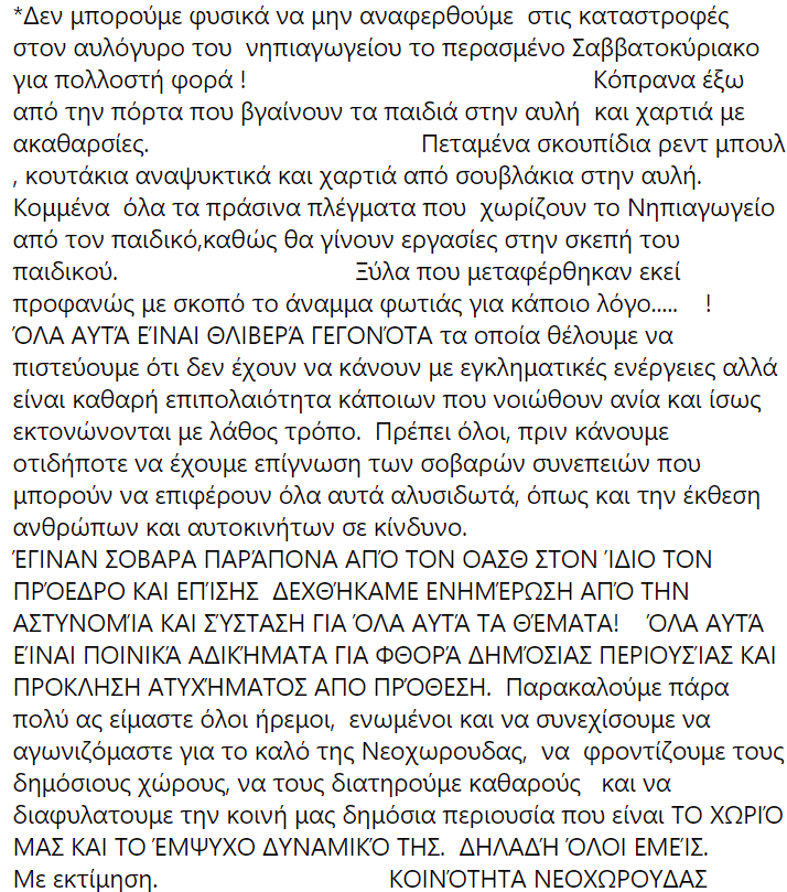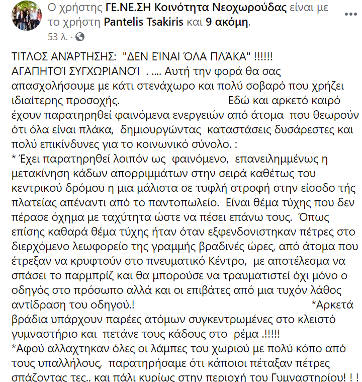 Για εσκεμμένες ενέργειες κάποιων που δημιουργούν «καταστάσεις δυσάρεστες και πολύ επικίνδυνες για το κοινωνικό σύνολο», κάνει λόγο με ανάρτησή της στο διαδίκτυο η «ΓΕ.ΝΕ.ΣΗ Κοινότητα Νεοχωρούδας».