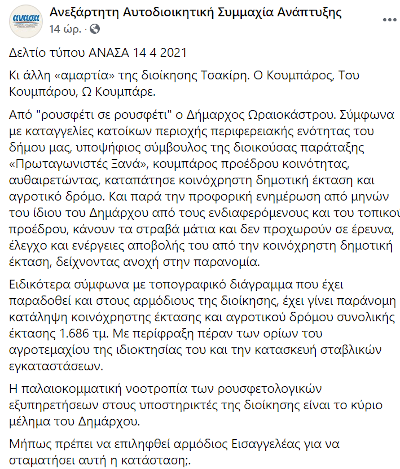 Χωρίς να κατονομάζει τη δημοτική ενότητα αλλά ούτε και το πρόσωπο το οποίο φέρεται να εμπλέκεται στην «καταπάτηση κοινόχρηστης δημοτικής έκτασης και αγροτικού δρόμου», ο κ. Σκαρλάτος κατηγορεί τόσο τον Δήμαρχο όσο και τον πρόεδρο Τοπικού της δημοτικής ενότητας για ρουσφετολογική συμπεριφορά.